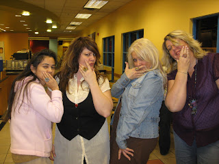 In an effort to keep my promise to put my bead work up on this blog- which was my original intention, until I learned that ranting and raving was more fun, I am finally putting up pictures of my work. Okay, it is being worn by my fabulous friends (one step at a time to showing the real deal, I promise.) I made rings for Amy, Sara, Arla, Jessi ,Veronica and yes even me. They are the same style but in fabulous colors. I am wearing one outrageous piece called "The Purple Tiger". A nice piece of art if I do say so myself. Check em out...